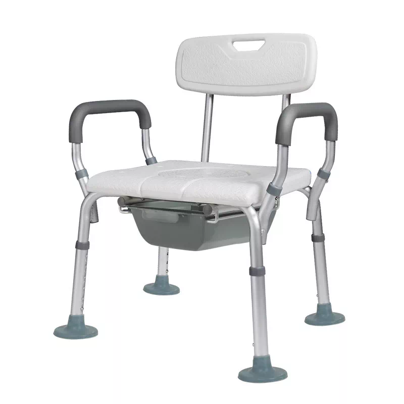 這款淋浴椅主架由高強度鋁合金組成,表面陽極氧化亮面處理,美觀大方,沖涼坐便兩用,兩側增有稱重橫桿,提升承重效果。坐板采用無縫縫合全皮革開口U行坐板,舒適度高,防水性能好,坐板可以上翻,方便便桶提出來。輪子采用360度旋轉小輪,后面兩個輪子帶自鎖剎車,整體高度3檔可調,安全靜音,耐用。踏板全鋁合金焊接而成,可拆卸,上翻,踏板前部位帶有地面支撐腳,防止人踩在上面椅子向前翻,支撐腳高度2檔可調。靠背可拆裝,帶有推手,靠背表面及扶手表面有防滑紋,防水防滑,安全耐用。