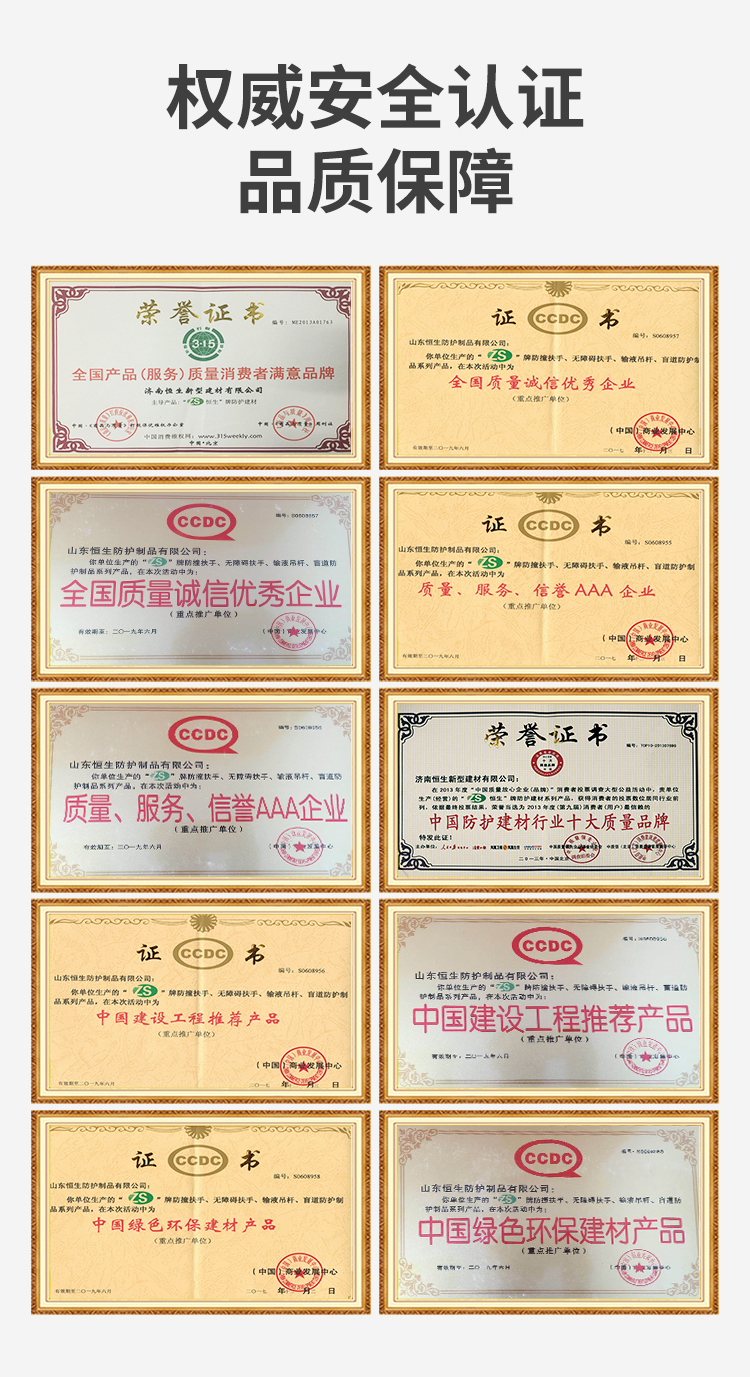 誠信是靈魂、是生命,是品牌生存與發展的永恒動力。恒生作為一家集研發、生產、銷售為一體的專業從事防護扶手及無障礙設施的現代化生產型企業,多年來對誠信的堅守、對品質的執著,一直秉承著以誠信、敬業、激情、精進、客戶第一、擁抱變化為價值觀,為整個防護制品行業樹立了很好的范本。