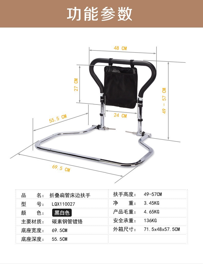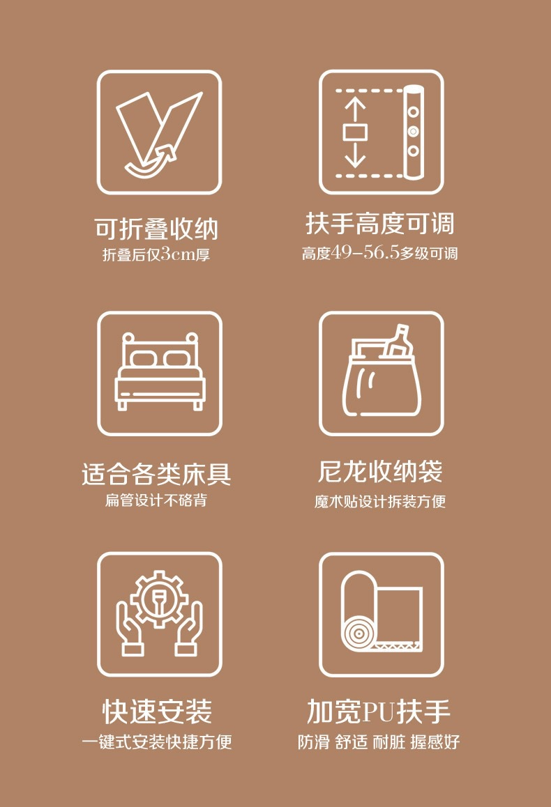 受傷或是行動不便的殘障人士,起身困難時可以使用床邊扶手輔助起身,方便行動,提高生活質量。